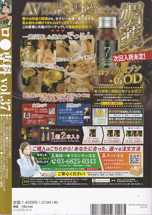 ロ〇専科Vol.37 ロ〇専科Vol.37(WM-27) (s14859) 表示価格より20% OFF 作者:-出版社:インフォメディアサイズ:A4出版日:R7.4.1–詳細:(オールカラー)DVD付(240分)。和久井美都兎カバー)、天沢りん、千川とわ、幾野まち、美咲音、白石もも、他。程度:上/状態:-ゾッキ(問屋から仕入れている新古本ですが、当店では状態のよい古本という意味です。決して未読・新品として販売しているものではございません。)登録日:R7.9.27 在庫状態 : 在庫有り ¥1,400 ¥930(税込) 数量冊