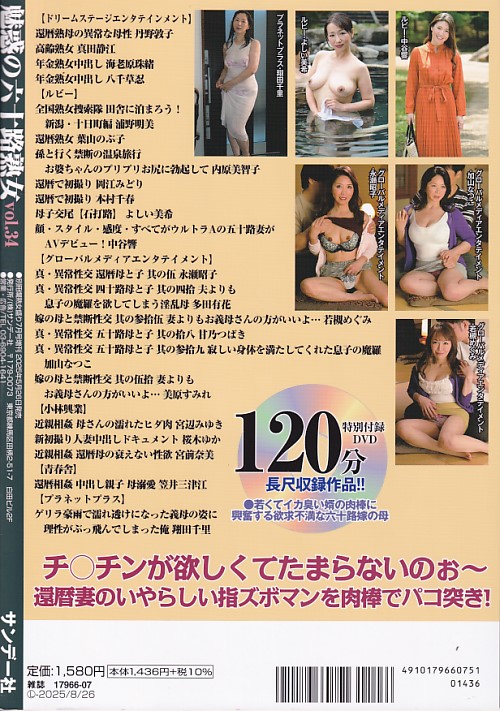 魅惑の六十路熟女Vol.34 魅惑の六十路熟女Vol.34(WM-49) (s14877) 表示価格より20% OFF 作者:-出版社:サンデー社サイズ:A4出版日:R7.5.26–詳細:(オールカラー)DVD付(2時間)。美原すみれ(カバー)、本村千春、葉山のぶ子、内原美智子、岡江みどり、浦野明美、丹野敦子、真田静江、海老原珠緒、八千草忍、宮辺みゆき、桜木ゆか、宮前奈美、永瀬昭子、笠井三津江、他。程度:上/状態:-ゾッキ(問屋から仕入れている新古本ですが、当店では状態のよい古本という意味です。決して未読・新品として販売しているものではございません。)登録日:R7.10.31 在庫状態 : 在庫僅少 ¥1,580 ¥1,100(税込) 数量冊